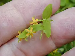 Листья продолговатой или яйцевидной формы, достигают 0,4—1,4 см в длину и 0,2—0,7 см в ширину, тупые, с большим количеством желёзок, просвечивающимися в виде точек, сидячие, практически стеблеобъемлющие, в основании находится 5 жилок, края листьев цельные.