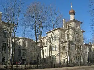 В комплексе имеется церковь во имя Христа Целителя с иконой Мадонны с младенцем авторства К. Петрова-Водкина на фасаде. Для иконы сделана арочная ниша (киот). Для восприятия издали и соответствия архитектурной основе рисунок лаконичен, его формы крупные, цвета плоские, контрастные кирпичной облицовке стен — синий, голубой, жёлтый и зелёный. Нимб заполнен цветочным золотым орнаментом. По словам самого художника, это была его первая грандиозная работа, хотя он остался недоволен цветом изразцов, в частности, желтизной лица Богоматери[9].