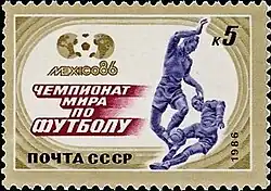 - ↑ Чемпионат мира по футболу «Мехико-86». На многоцветной марке медаль чемпионата. Глубокая печать перфорирована: рамочная зубцовка 11½ (на каждые 2 сантиметра края марки приходится 11½ зубцов). В марочных листах 50 (5×10) и малые листы (кляйнбогены) 8 (2×4) марок с художественно оформленными полями, дополнительным тиражом 15 000 экземпляров или 120 000 марок[2][14][15][16].
