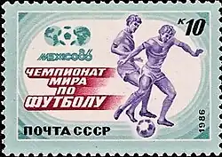 - ↑ Чемпионат мира по футболу «Мехико-86». На многоцветной марке скульптура футболистов. Глубокая печать перфорирована: рамочная зубцовка 11½ (на каждые 2 сантиметра края марки приходится 11½ зубцов). В марочных листах 50 (5×10) и малые листы (кляйнбогены) 8 (2×4) марок с художественно оформленными полями, дополнительным тиражом 15 000 экземпляров или 120 000 марок[2][14][15][16].