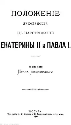 - ↑ Научное наследие России. Знаменский И. С. Положение духовенства в царствование Екатерины II и Павла I. Дата обращения: 21 апреля 2016. Архивировано 21 апреля 2016 года.