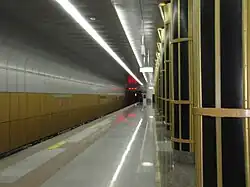 - Первая, промежуточная, очередь включала: левый (от ПК 81+89,4 до ПК 81+83,68) и правый перегонный тоннели (от ПК 76+61,19 до ПК 89+83,68); вестибюль № 2 без лифтов — с двумя входами (пятым и шестым); частично первый вестибюль (служебные помещения); платформу (без площадки перемещения инвалидов); ИТП (вход № 2); узел вентиляции; участок ввода коммуникаций и воздушно-кабельный коллектор от него до ТПП; участок открытого способа работ (с камерой съездов). Кроме того, на этом этапе предполагалось построить наружные инженерные коммуникации и реконструировать городские сети, находящиеся в зоне метро, а также благоустроить территорию. Срок выполнения работ — 2010 год.