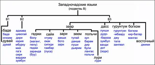 - 1 2 Lewis M. P., Simons G. F., Fennig C. D.: Afro-Asiatic. Chadic. West (англ.). Ethnologue: Languages of the World (19th Edition). Dallas: SIL International (2016). Архивировано 27 ноября 2016 года. (Дата обращения: 2 февраля 2017)