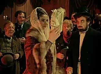 В то же время образ Гани Иволгина, созданный Никитой Подгорным, обрисован в картине гораздо ярче, чем в театральных постановках второй половины 1950-х годов. Ганя, не испытывая любви к Настасье Филипповне, соглашается за деньги вступить с нею в брак. Одновременно он готов вести торг с богатой невестой Аглаей Епанчиной. Сцена диалога князя Мышкина и Иволгина-младшего, когда последний откровенно признаётся, что с деньгами он сможет обрести власть и стать человеком «в высшей степени оригинальным», сыграна, по утверждению Погожевой, «с огромной экспрессией»[28].