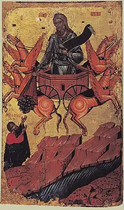 Как в иудаизме, так и в христианстве считается, что Илия был взят на Небо живым: «вдруг явилась колесница огненная и кони огненные, и разлучили их обоих, и понесся Илия в вихре на Небо» (4Цар. 2:11). Согласно Библии, до него живым на небеса был взят лишь Енох, живший до Потопа (Быт. 5:24). Впрочем, в православном богословии есть мнение, что Илия был вознесён не на небо, но в некое сокровенное место, в котором и ожидает дня Второго пришествия Иисуса Христа[9]. Согласно церковному преданию, Илия вместе с Енохом является одним из апокалиптических «двух свидетелей» (Откр. 11:3), которые по окончании своего свидетельства будут убиты зверем, «выходящим из бездны» (Откр. 11:7)[10].