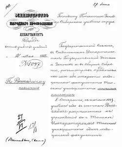 В мае 1888 года постановлением Министерства народного просвещения Сибирский Императорский университет переименован в Императорский Томский университет[7].