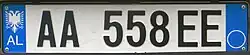 Регистрационный номерной знак Албании выполняется чёрными буквами на белом фоне. Повторяет вид итальянских номеров образца 1994 года.