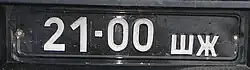 Для прицепной техники существует свой вид номеров — квадратная пластина белого цвета со скошенными нижними углами, на которой чёрными символами написаны четыре цифры в верхнем ряду и две буквы — в нижнем, первая буква обозначает регион регистрации.