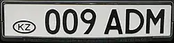 - Номера автомобилей технического, обслуживающего аппарат Администрации Президента Казахстана и Парламент РК имеют два формата. Первый формат— на белом фоне после изображения буквенного индекса KZ чёрного цвета в белом овале с чёрной каймой, следуют чёрными символами три цифры и три буквы ADM (сокращение от «Администрация»). Второй формат — на белом фоне после изображения буквенного индекса KZ белого цвета в голубом овале с чёрной каймой, следуют чёрными символами три цифры и три буквы AST (сокращение от «Астана»).
