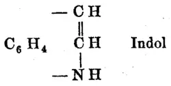 Изучение индола началось с изучения растительного красителя индиго. Из индиго окислением можно получить изатин, а затем в индоксил. В 1866 году Адольф фон Байер восстановил цинковой пылью индоксил до индола[2]. В 1869 году он предложил химическую структурную формулу для индола (на рисунке слева)[3].
