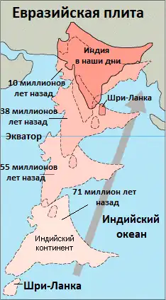 Она начала двигаться на север, примерно на 20 см/год[1], и стала сталкиваться с Азией, примерно 50—55 миллионов лет назад, в эпоху эоцена кайнозойской эры. За это время Индийская плита покрыла расстояние от 2000 до 3000 км, и двигалась быстрее, чем любая другая известная плита. В 2007 году немецкие геологи установили, что причиной быстрого движения является половинная толщина Индийской плиты, по сравнению с другими плитами, составлявшими ранее Гондвану[1].