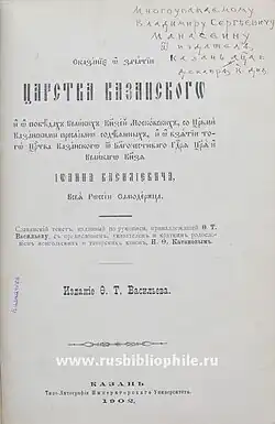 Обложка книги «Сказание о зачатии Царства Казанского и о победах Великих Князей Московских, … и о взятии того Царства Казанского.» Казань, 1902.