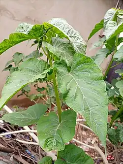 Листья 10–25 см длиной и 5–8 см. в ширину, цельные, более-менее округло-ланцетовидные, опушённые или реже гладкие с обеих сторон. Базальная часть сердцевидная, усеченная или ушковидная, верхушка заостренная или округлая. Черешки длинные, 4–6 см.