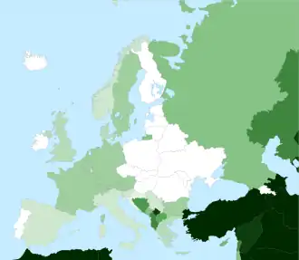 - Примечание: части территорий Турции и Азербайджана географически находятся в Европе (европейской части континента) и являются исламскими более чем на 99 %.