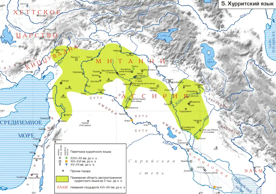 На рубеже 3—2-го тысячелетий до н. э. масштабное переселение племён амореев сузило сферу влияния хурритов, а аморейское государство Мари подчинило Уркеш. Между тем, вторжение на Армянское нагорье индоарийцев принесло на Ближний Восток колесницы, быстро ставшие одним из решающих факторов при ведении боевых действий. Опираясь на ударную силу колесниц, хурриты вскоре смогли освободить от амореев часть Северной Месопотамии, где около XVII века до н. э. образовалось государство Ханигальбат, принявшее также древнее имя «Хурри». Изнурительные войны с Древнехеттским царством ослабили Хурри-Ханигальбат, чем воспользовались индоарийские племена «манда» («умман-манда», «маитанне»); около 1560 года до н. э. они захватили власть в Ханигальбате, дав своим именем новое название государству — Мита́нни[31] (собственно Маитанне, использовалось также старое название — Ханигальбат). К концу XVI века до н. э. Митанни превратилось в крупнейшее государство Верхней Месопотамии и одну из влиятельных держав Передней Азии.