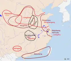 Китайская цивилизация (предков государствообразующего этноса хань) — группа культур (Баньпо 1, Шицзя, Баньпо 2, Мяодигоу, Чжуншаньчжай 2, Хоуган 1 и др.) среднего неолита (ок. 4500—2500 гг. до н. э.) в бассейне реки Хуанхэ, которые традиционно объединяются общим названием Яншао. Представители этих культур выращивали зерновые (чумиза и др.) и занимались разведением свиней. Позднее в этом районе распространилась культура Луншань: появились ближневосточные виды злаков (пшеница и ячмень) и породы домашнего скота (коровы, овцы, козы). Синхронно Яншао существовала культура Хуншань, сформировавшаяся на основе местной культуры Синлунва. У представителей культуры Хуншань определили Y-хромосомные гаплогруппы N1 (xN1a, N1c), С и O3a (O3a3)[29][30].