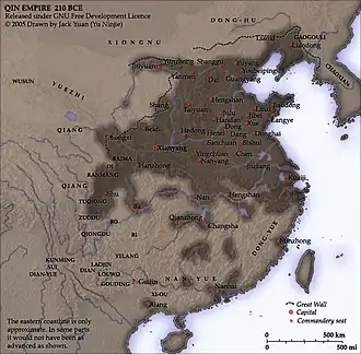 При императоре Цинь Шихуанди были соединены оборонительные стены (валы) северных чжоуских царств и создана Великая китайская стена. Было сооружено несколько стратегических дорог из столицы на окраины империи. В результате успешных войн на севере хунну (сюнну) были оттеснены за Великую стену, также были присоединены значительные территории племён юэ, в том числе северная часть современного Вьетнама.