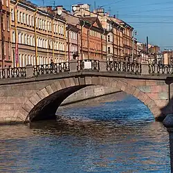 В это же время были построены первые каменные мосты, например в каменный был переделан Аничков мост[12][100]. Серия каменных мостов была построена через одетую в гранит Фонтанку. Многие каменные мосты были реконструированы в XIX веке и не дошли до наших дней в первозданном виде. По задумке главного градостроителя Квасова, петербургские улицы должны были тянуться вдоль водных магистралей, или брали своё начало у реки и заканчивались у храма. Через каналы строилось множество мостов, около которых создавались предмостовые площади[13]. Постоянных мостов через Неву не было, так как с применением технологий того периода построить их было невозможно, так что горожане перемещались через акваторию Невы на лодках летом и по льду зимой[101]. Тем не менее были построены деревянные наплавные мосты через Неву, соединявшие Васильевский остров с Петербургской стороной[17] и оттуда на Выборгскую сторону через Невку[17]. Крупнейшим проектом был Воскресенский плашкоутный наплавной мост и второй мост через Неву[102]. Зимой на льду Невы устраивались деревянные горки[101].