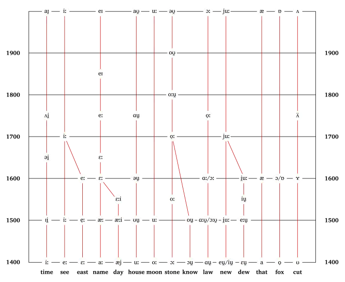 - Звук /uː/ превратился в дифтонг [uʊ], затем в [əʊ], и, наконец, стал современным дифтонгом [aʊ] (как в mouse), в XVIII веке после согласных r и d сдвига не произошло, и [uː] остался прежним, как в словах room и droop).
