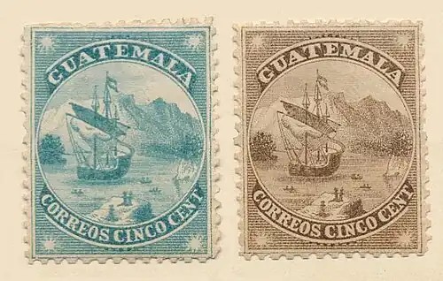 Первые почтовые марки Гватемалы были выпущены в 1871 году[6][13][14][15][≡]. На напечатанных Национальной типографией в Париже марках изображён герб Гватемалы[15]: