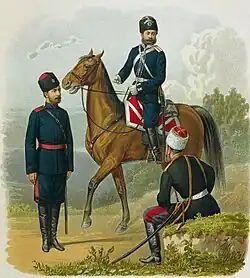 2. Илл. 55. Казачьи Войска: Генерал-Адъютант, Обер-Офицер Лейб-Гвардии Казачьего Его Величества полка и Казак полевых конных полков Уральского Казачьего войска (в обыкновенной форме). (приказы по воен. вед. 1883 г. №№ 64 и 72 ) // Иллюстрированное описание перемен в обмундировании и снаряжении войск Императорской Российской армии за 1881–1900 гг.: в 3 т.: в 21 вып.: 187 рис. / Сост. в Техн. ком. Гл. интендантского упр. СПб.: Картографическое заведение А.Ильина, 1881–1900.