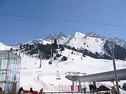 От южной до восточной части Казахстана вдоль границ с Кыргызстаном и Китаем протягиваются хребты северной окраины Тянь-Шаня, достигая на стыке границ Казахстана, Кыргызстана и Китая почти 7 тыс. м над уровнем моря (пик Хан-Тенгри, 6995 м). На юго-востоке страны расположены хребты Джунгарский Алатау и Заилийский Алатау, у подножья Заилийского Алатау находится бывшая столица Казахстана и крупнейший город страны — Алма-Ата.