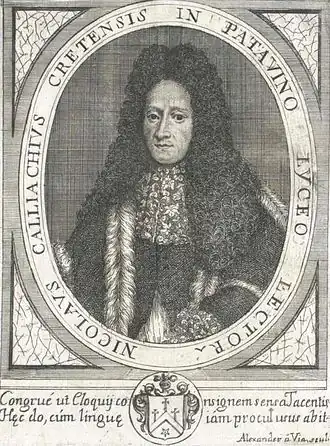 - ↑ Feller, François-Xavier de. Dictionnaire historique, Volume 2. — Mathieu Rieger fils, 1782. — С. 18.. — «CALLIACHI, ( Nicolas ) grec de Candie , y naquit en 1645. Il profefla les belles».