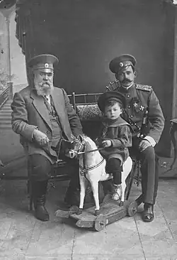 - Фёдор Григорьевич (р. 22 мая 1846 (по др. источнику — 1848[33]), станица Богоявленская — 1920-30 гг., Новочеркасск), из дворян, казак станицы Богоявленской. Награждён медалью «За усмирение польского мятежа 1863—1864». В службе казаком с 8 марта 1864. В полку № 40 Сергеева с 1 июня 1864 по 6 февраля 1866. Урядником с 9 мая 1865. В полку № 56 Кушнарёва с 6 февраля 1866 по 10 ноября 1867. В полку № 51 с 10 ноября 1867 по 3 января 1869. Произведён в хорунжие 29 апреля 1869. Сотником с 27 июня 1872. В отставке с 29 августа 1873. Вновь в службе сотником с 18 апреля 1878 со старшинством с 14 февраля 1877. Сотник, состоящий по Войску Донскому; отставка с чином подъесаула — 2 сентября 1889[34]. Третья жена — дочь полковника Донцова Любовь Фёдоровна. Дети: от 1-го брака — Анастасия[* 6] (р. 23 декабря 1872), от 3-го брака — Антонина (р. 8 мая 1881),[35] Лидия,[* 7] Михаил, Дмитрий.[* 8].