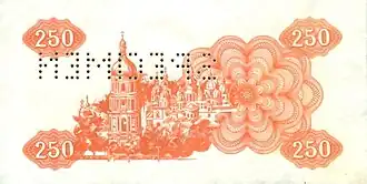 | Банкноты | 1, 3, 5, 10, 25, 50, 100, 200, 500, 1000, 2000, 5000, 10 000, 20 000, 50 000, 100 000, 200 000, 500 000 и 1 000 000 карбованцев | ||