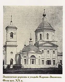 Вместо сгоревшей сельской деревянной Покровской церкви в 1743—1745 годах на площади перед барским домом и парком по заказу Александра Артемьевича Загряжского[2] была построена одна из первых в Тамбовской губернии каменная церковь, посвящённая иконе Божией Матери «Знамение». По этой церкви село получило название Знаменское[3] (сейчас — Знаменка). Постройка была выполнена по распространённой в то время схеме «восьмерик на четверике». Легенды, связывающие с созданием Знаменской церкви имена В. Расстрелли и В. Баженова, не имеют под собой никакой реальной почвы. Возможно, что церковь в Кариане и церковь в ещё одном поместье Загряжских — Яропольце — строил один и тот же архитектор. В конце XVIII века к храму были добавлены два придела — святого Николая Чудотворца и святой мученицы Александры[1][4] известен по фотографиям начала XX века.