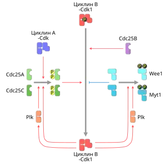 В регуляцию митоза у всех эукариот вовлечена циклин-зависимая киназа Cdk1[79], которая представляет собой фермент (фосфорилазу), модифицирующий белки за счёт переноса фосфатной группы от АТФ на аминокислоты серин и треонин. Концентрация Cdk1 постоянна на протяжении всего клеточного цикла[80], поэтому активность циклин-зависимой киназы в процессе митоза зависит главным образом от её соединения с митотическим циклином. Концентрация митотических циклинов увеличивается по мере приближения к митозу и достигает максимума в метафазе. Различным таксонам свойственны различные митотические циклины. Так, у почкующихся дрожжей в регуляцию митоза вовлечены четыре циклина Clb1, 2, 3 и 4; у дрозофилы — циклины A, B, B3; у позвоночных — циклин B[81].