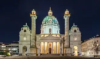 Карлскирхе (нем. Karlskirche) — католическая церковь, расположенная в южной части Карлсплац, в Вене. Находится на самом краю района Внутренний город рядом с Рингштрассе. Один из символов города. Карлскирхе является ярким примером оригинального стиля австрийского барокко. Особенно выделяется громадный купол и две огромных колонны, фланкирующих портик в римском стиле. Высота храма — 72 метра. Внутри был устроен лифт, с помощью которого можно было подняться к лантерне купола и увидеть фрески и город Вену с высоты птичьего полёта. В 2020 году лифт был разобран. В церкви Карлскирхе регулярно проводятся концерты классической музыки[3].