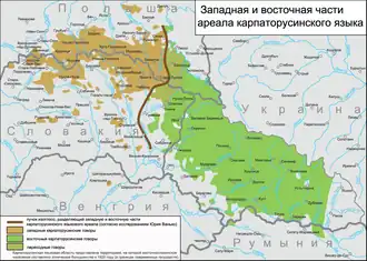Согласно лингвистическим факторам (характеру распределения пучков изоглосс) и отчасти экстралингвистическим факторам, карпаторусинские диалекты делятся на западную и восточную группы. Западная (или северо-западная) группа включает севернолемковские говоры (в Польше) и южнолемковские говоры (в Словакии), а восточная группа включает закарпатские (среднезакарпатские) говоры и севернозакарпатские (бойковские) говоры (на Украине). Каждая из подгрупп состоит из ряда более мелких диалектных образований. Основная изоглосса пучка, разделяющего карпаторусинский ареал на западную и восточную части — характер ударения: в лемковских говорах ударение фиксировано на предпоследнем слоге как в польском языке и в восточнословацком диалекте, в восточных говорах ударение разноместное и подвижное как в украинском языке. Эта изоглосса дополняется большим числом других изоглосс, проходящих примерно в одном и том же направлении с севера на юг по реке Лаборец. Западный ареал включает в себя языковые элементы западнославянских языков, в основном словацких — в говорах к югу от Карпат, и в основном польских — в говорах к северу от Карпат. Восточный ареал во многом сближается с украинским языком[36].