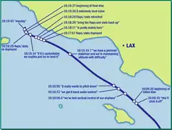 В 15:49, находясь в районе Лос-Анджелеса, пилоты сообщили диспетчеру о неполадках, связанных с горизонтальным оперением. Ни авиадиспетчер, ни экипаж не могли понять причину отказа; неоднократные попытки пилотов исправить неполадки не увенчались успехом. Также пилоты несколько раз обсуждали с диспетчером вопрос: аварийно садиться в Лос-Анджелесе или же продолжать лететь до Сан-Франциско; при этом диспетчер настаивал лететь до Сан-Франциско.