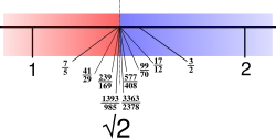 | Рациональные приближения | 3/2; 7/5; 17/12; 41/29; 99/70; 239/169; 577/408; 1393/985; 3363/2378; 8119/5741; 19601/13860; 665857/470832