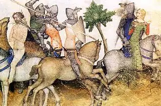 Высший класс, или дворянство, представленный в основном рыцарями и их оруженосцами, во времена Чосера был погружён в культуру рыцарства и учтивости. От дворянства ожидалось, что они будут сильными воинами, безжалостными на поле боя, но учтивыми при королевском дворе и христианскими в своих поступках[50]. От рыцарей ожидалось, что они будут поддерживать тесные социальные связи с мужчинами, которые сражались вместе с ними, но ещё более тесные связи с женщинами, которых они идеализировали, чтобы укрепить свои боевые навыки[51]. Хотя целью рыцарства было благородное поведение, его противоречивые ценности часто приводили к насилию. Церковные лидеры часто пытались ввести ограничения на рыцарские поединки и турниры, которые иногда заканчивались смертью проигравшего. В «Рассказе рыцаря» показано, как братская любовь двух рыцарей превращается в смертельную вражду при виде женщины, которую оба идеализируют. Чтобы завоевать её, оба готовы сражаться до смерти. Во времена Чосера рыцарство приходило в упадок, и, возможно, «Кентерберийские рассказы» были написаны для того, чтобы показать его недостатки, хотя это и оспаривается[52]. Сам Чосер участвовал в Столетней войне под командованием Эдуарда III, который во время своего правления уделял большое внимание рыцарству[53]. Две истории, «Рассказ о сэре Топасе» и «Рассказ о Мелиби», рассказаны самим Чосером, который путешествует с паломниками в своём рассказе. Обе истории, по-видимому, посвящены пагубным последствиям рыцарства: первая высмеивает рыцарские правила, а вторая предостерегает от насилия[54].