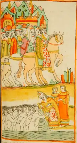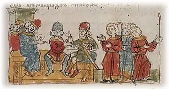 Традиционно, начиная с русской летописи «Повесть временных лет» начала XII века и до настоящего времени, возникновение, начало Русского государства относится к 862 году, к призванию варягов[54][κ][55][56]. Согласно русским летописям, в этом году северные племена восточных славян и финно-угров, ранее изгнавшие неких варягов, призвали на княжение варягов-русь во главе с Рюриком. Ответ на главный вопрос «Повести временных лет» «откуду есть пошла Русская земля», вынесенный в заглавие летописи, содержится в рассказе о призвании варягов под 862 годом: князья принесли с собой варяжское имя Русь, и «от тех варяг прозвася Русская земля». Началом Руси составитель летописи считал призвание варяжских князей, а не поход на Царьград русской дружины[λ][μ]. В то же время дата 862 года является символической[57]. Некоторые историки относят начало Русского государства к другому времени или привязывают к другому событию (например, к 882 году, когда князь Олег захватил Киев[8], объединив два центра Руси).