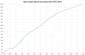 По численности населения[12] — 1 411 750 000 жителей (без Тайваня, Гонконга и Макао[13][14]) — занимает второе место в мире после Индии[15]. Уровень урбанизации равен 65 %[14]. Китай — многонациональное государство, но на сегодняшний день большинство его населения составляют этнические китайцы с самоназванием хань.