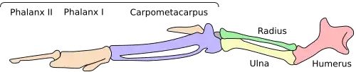 Крыло колибри включает десять первостепенных маховых перьев[6][7][8], размер которых постепенно увеличивается от внутренней части крыла к внешней почти у всех представителей семейства. Исключение составляют трёхцветный селасфорус (Selasphorus platycercus) и вымпелохвостые колибри (Trochilus), у которых внешние первостепенные маховые перья слегка уменьшены, а также колибри-саблекрылы (Campylopterus), у которых в разной степени утолщены три внешних пера. У колибри шесть или семь коротких второстепенных маховых перьев[6][7][8]. Крылья колибри редко бывают яркими, их цвет основан на пигментах, как и у почти всех других птиц, и может быть матово-охристым, буроватым или чёрным[9][6] (исключение составляет Eulampis jugularis[6]). Возможно, этому способствовала адаптация к специфическому полёту, так как для ярких перьев характерно отсутствие крючочков между бороздочками, что уменьшает механическую прочность лопасти крыла[6][11]. У маховых перьев колибри бороздки очень узкие, направленные в сторону кончика пера, при этом крючочки соединяют бороздочки только в одном направлении[11].