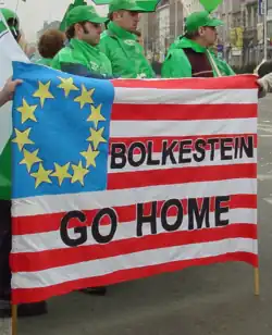Одним актом, унаследованным от комиссии Романо Проди, была Директива об услугах на внутреннем рынке, известная как «Директива Болкестайна», целью которой была либерализация сферы услуг. Первый вариант директивы был встречен протестами не только со стороны профсоюзов и граждан, но и со стороны некоторых глав государств-членов ЕС. Наибольшее возмущение вызвал принцип «страны происхождения». Он заключался в том, что компания, зарегистрированная в одной стране ЕС, но работающая в другой, может подчиняться законам страны регистрации. Это, по мнению критиков, привело бы к перемещению фирм в государства с меньшей заработной платой, более мягкими правилами в области защиты окружающей среды, прав потребителей и в области безопасности[49]. На этом фоне появилось и получило большое распространение выражение «польский сантехник» как синоним дешёвой рабочей силы из Восточной Европы.
