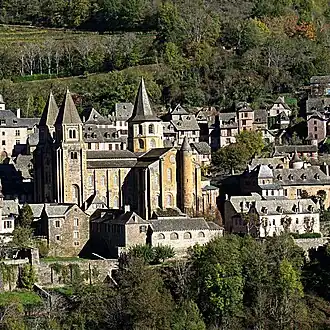 Средневековых паломников в Конк привлекала святыня св. Фе, мощи которой, по легенде, монахи украли из Ажена. Церковь аббатства, где почивают эти мощи, выстроена в XI—XII вв. в романском стиле и представляет собой образец монастырской архитектуры того времени.