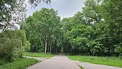 ![]() вход в лесопарк с северной стороны и информационный щит-указатель | |