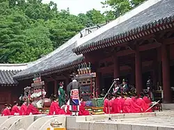 Музыкальное выступление в святилище предков (кор. 종묘 제례악?, 宗廟祭禮樂?, чонмё-череак) проходит ежегодно в мае. Это выступление имеет много общего с конфуцианской ритуальной музыкой, в частности, оно исполняется двумя оркестрами, однако набор инструментов отличается (добавлены духовые тэгым и танпхири, и ударный панхян)[56].