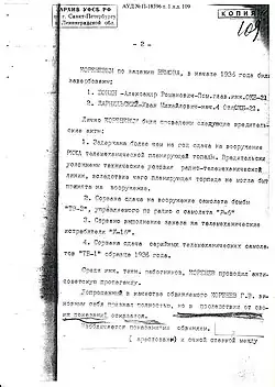 Помимо создания контрреволюционной троцкистско-вредительской группы с целью ослабления обороноспособности СССР и антисоветской агитации, ему вменялись в вину «вредительские» акты: намеренная задержка на год сдачи РККА телемеханической торпеды путём «усложнения технических условий радио-телемеханической линии»; срыв сдачи на вооружение самолёта-бомбы ТБ-3, управляемого по радио с самолёта «Р-6»; срыв выполнения заказа на телемеханические истребители «И-16» и сдачи серийных телемеханических самолётов «ТБ-1» образца 1936 г.[20] Подобные обвинения в то же самое время были предъявлены и другим заключённым специалистам.