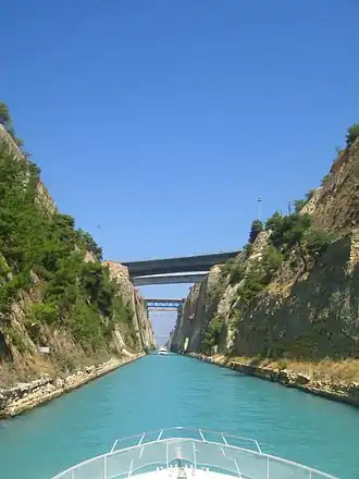 В конце XIX века в наиболее узком месте перешейка был построен Коринфский канал длиной около 6,4 км. Однако и до существования канала Коринфский перешеек с древних времён служил не только как путь сообщения Пелопоннеса с остальной Грецией, но и для сокращения водных путей из залива Сароникос в Коринфский залив. Через Истм шёл волок (путь), по которому греки переправляли свои суда из Коринфского залива Ионического моря в Саронический залив Эгейского моря[4].