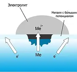 Разрушение металла под воздействием возникающих в коррозионной среде гальванических элементов называют электрохимической коррозией. При электрохимической коррозии всегда требуется наличие электролита (Конденсат, дождевая вода и т. д.), с которым соприкасаются электроды — либо различные элементы структуры материала, либо два различных соприкасающихся материала с различающимися окислительно-восстановительными потенциалами. Если в воде растворены ионы солей, кислот, или т. п., электропроводность её повышается, и скорость процесса увеличивается.