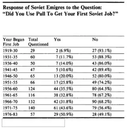 Согласно докладу ЦРУ 1985 г., агентство проводило опросы советских эмигрантов на предмет того, нужен ли им был блат (pull), чтобы получить первую работу[44]. Если среди искавших работу в 30е годы таких было 10-15 %, то среди искавших в конце 70х таких было уже 50 %.