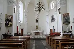 Постройка имеет однонефную структуру с полукруглым алтарным завершением, встроенным в общий прямоугольный план. Внутри неф перекрыт цилиндрическим сводом очень значительного пролёта с распалубками без подпружных арок. Единственная подпружная арка на сильно выступающих пилонах отделяет алтарную часть перекрытую конховым сводом с четырьмя радиальными распалубками). Во входной части (согласно кроку капитальной стены монастыря) выделен нижний неконструктивный нартекс[25].