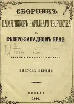 Директор виленского училища, член Общества любителей русской словесности, историк и фольклорист-славист П. А. Бессонов, в 1864―1867 годах, возглавлявший Виленскую археографическую комиссию, издал сборник песен-литаний старцев «Калики перехожие», в который вошли и белорусские песни. В 1871 году выпустил в Москве сборник «Белорусские песни с подробными объяснениями их творчества и языка, с очерками народного обряда и всего быта» с волочебными, юрьевскими, никольскими, купальскими и колядными песнями[113]. Бессонов писал о Белоруссии