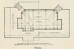 При внешней живописности проекта в его основу было положено чрезвычайно простое и логичное объёмно-пространственное решение: прямоугольный объём с одним залом, окружённый большой галереей-террасой на поддерживающих столбах. Асимметричность постройке придавали диагонально расположенные крыльца и ризалиты входных групп, перекрытые крышами на разных уровнях. Формообразующим принципом проекта стало функциональное назначение павильона, требовавшее больших нерасчленённых поверхностей для демонстрации экспонатов и отсутствия окон, что привело к новаторскому элементу — остеклённой крыше[19].
